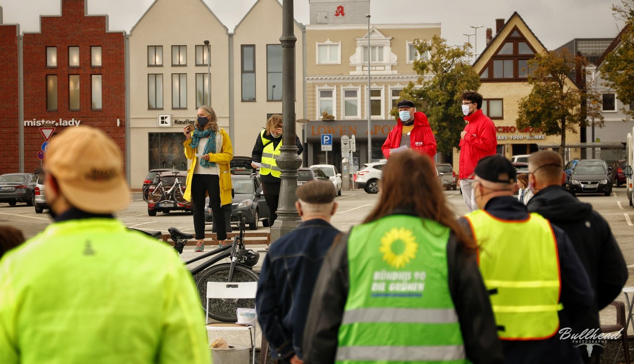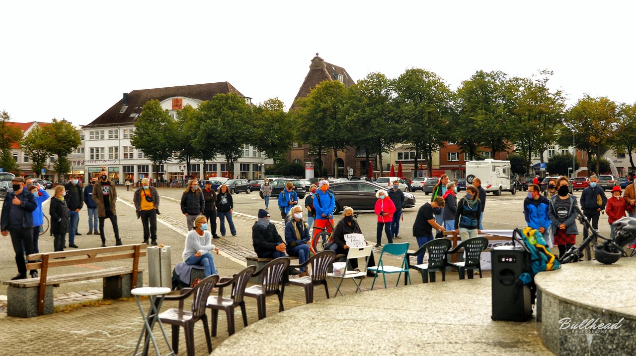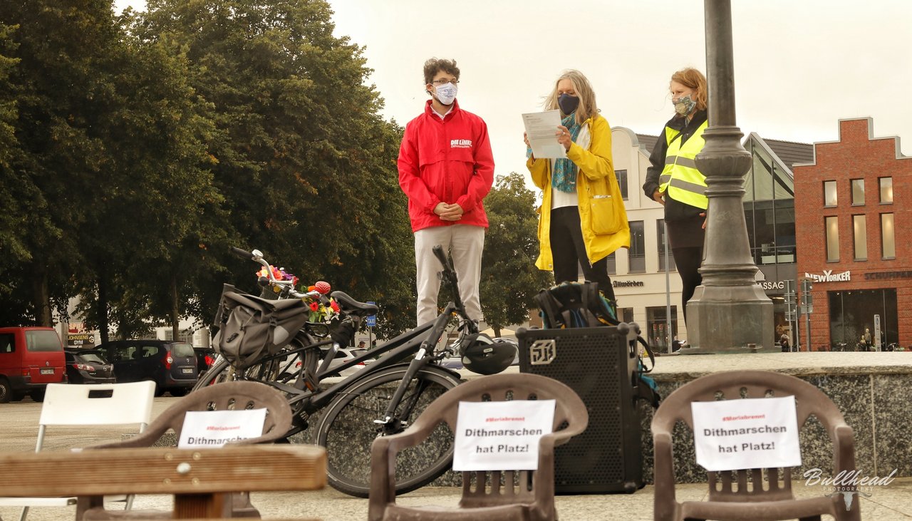 Auf der kurzfristig organisierten Kundgebung auf dem Heider Marktplatz am Sonnabend, den 12. September machten trotz widrigem Wetter knapp unter 100 Menschen deutlich, dass auch in Dithmarschen Platz für die Flüchtlinge aus dem abgebrannten Lager in Moria auf der griechischen Insel Lesbos ist. Aufgerufen hatten zu dieser Kundgebung die GRÜNEN, die Linke, "Dithmarschen sagt Moin" und andere. Die Redner*innen machten deutlich, dass eine sofortige Aufnahme der Flüchtlinge aus Moria im Sinne der für alle geltenden Menschenwürde erfolgen muss.